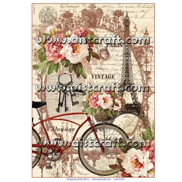 Rižev papir AistCraft © za uporabo v tehniki decoupage oz. v servietni tehniki. Zelo tanek in lahek 28 g / m2. Vsebuje jasno vidna vlakna nepravilnega profila, razporejena v vseh smereh po celotni površini papirja, kar mu daje izviren videz in strukturo. Na steklo, les, mdf, sveče ga je enostavno lepiti z lepilom za decoupage ali servietno tehniko.