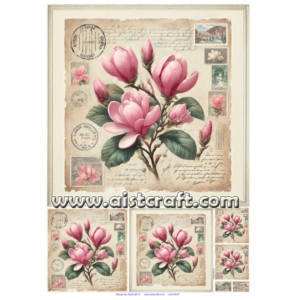 Rižev papir AistCraft © za uporabo v tehniki decoupage oz. v servietni tehniki. Zelo tanek in lahek 28 g / m2. Vsebuje jasno vidna vlakna nepravilnega profila, razporejena v vseh smereh po celotni površini papirja, kar mu daje izviren videz in strukturo. Na steklo, les, mdf, sveče ga je enostavno lepiti z lepilom za decoupage ali servietno tehniko.