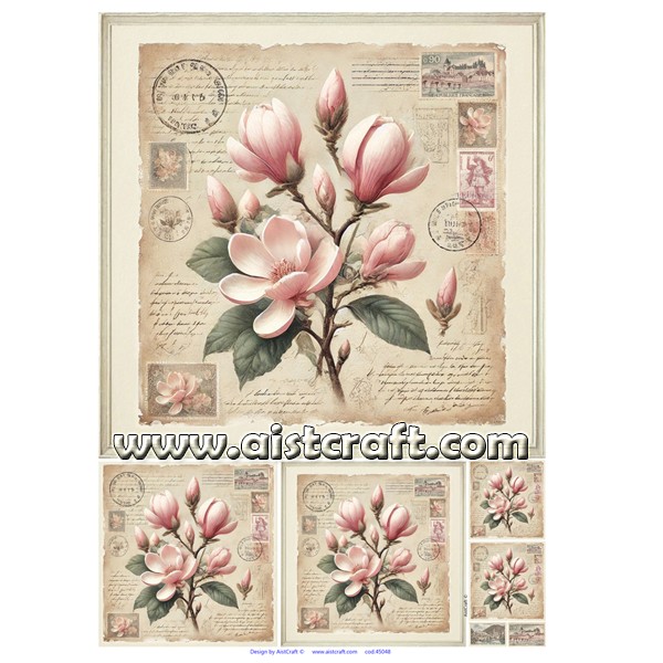 Rižev papir AistCraft © za uporabo v tehniki decoupage oz. v servietni tehniki. Zelo tanek in lahek 28 g / m2. Vsebuje jasno vidna vlakna nepravilnega profila, razporejena v vseh smereh po celotni površini papirja, kar mu daje izviren videz in strukturo. Na steklo, les, mdf, sveče ga je enostavno lepiti z lepilom za decoupage ali servietno tehniko.
